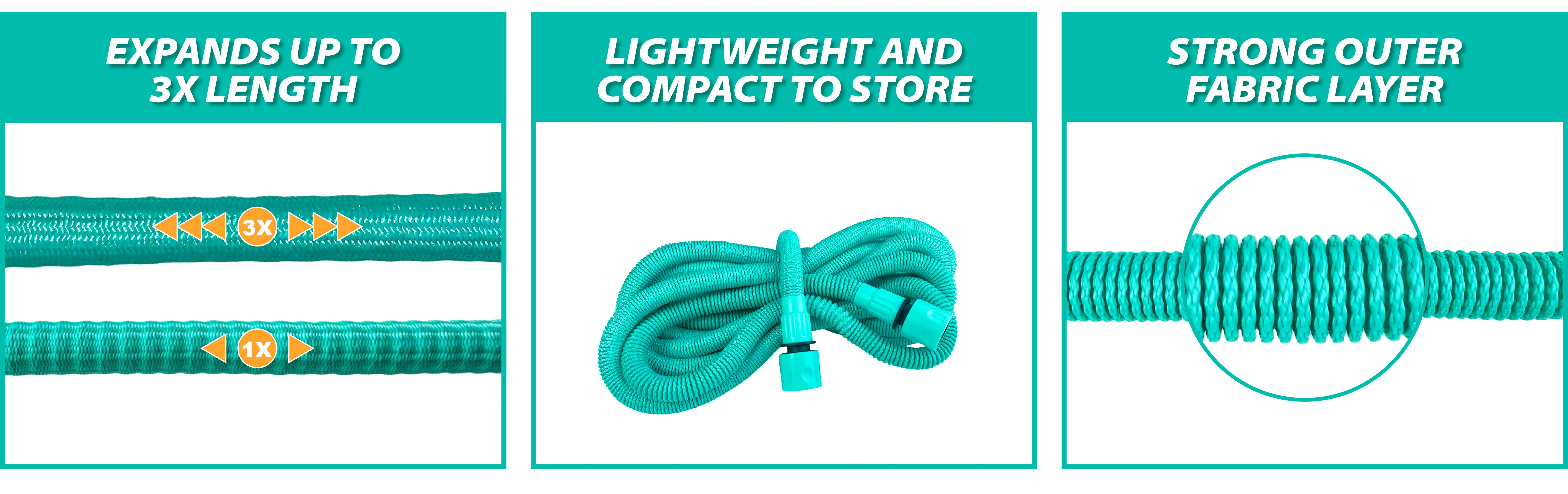 Starts compact (e.g., 25ft), expands to full length (75ft) with water pressure for incredible reach.